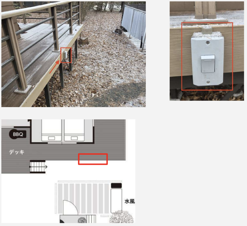 サウナ内のライトのスイッチはウッドデッキ脇にボタンが設置されております。