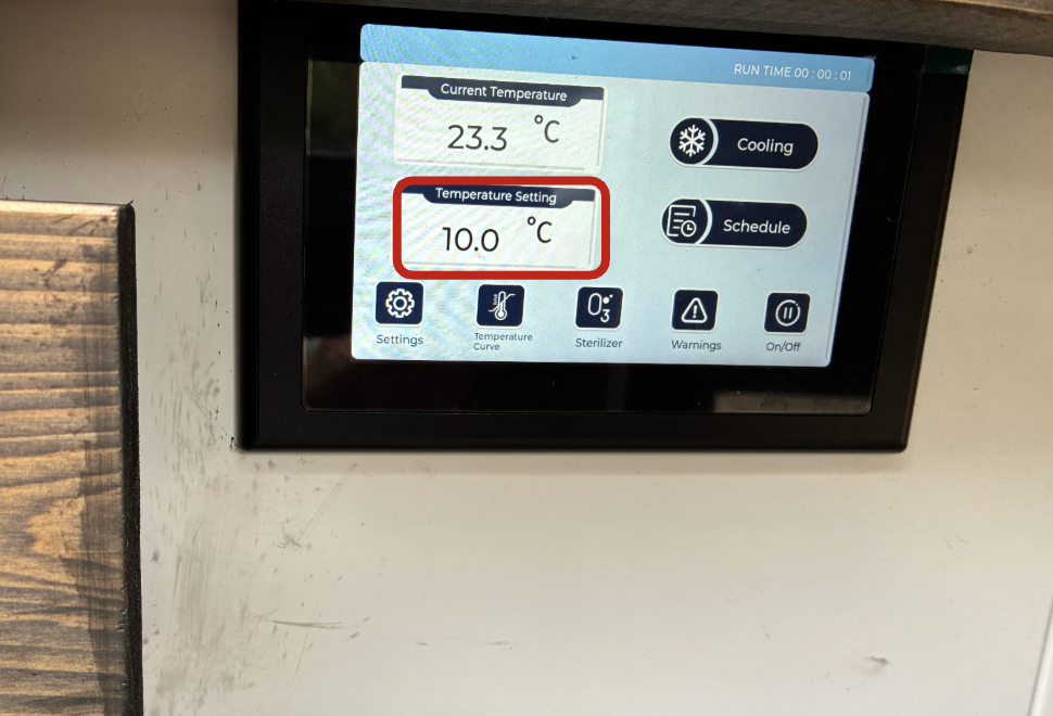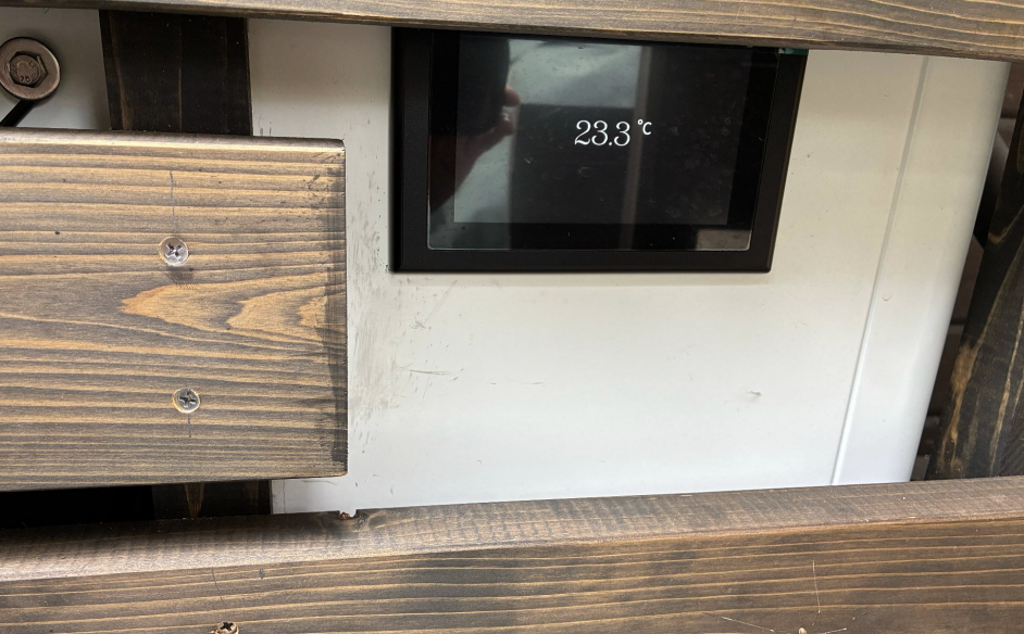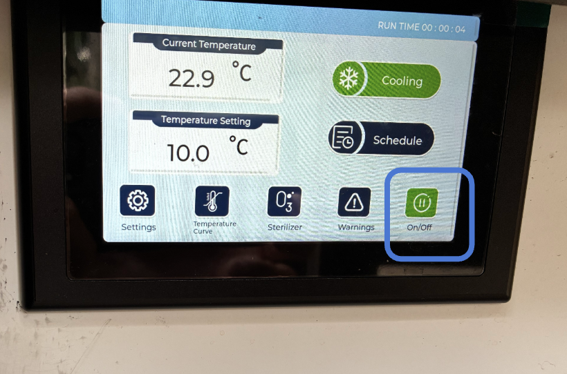 赤枠の温度調整のパネルになりますので温度調整後、青枠のONを押し数分待ち完了。利用後は再度ボタンを押しOFFを押してください。