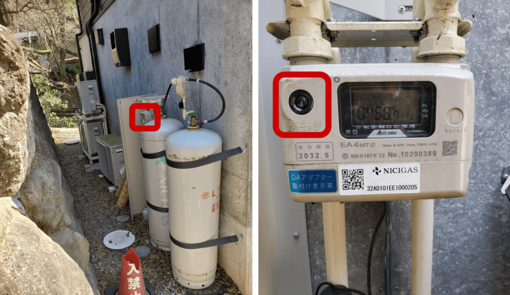 3:ガスボンベ上にあるメーターを確認。メーターの左下にある「復帰」のボタンを押す