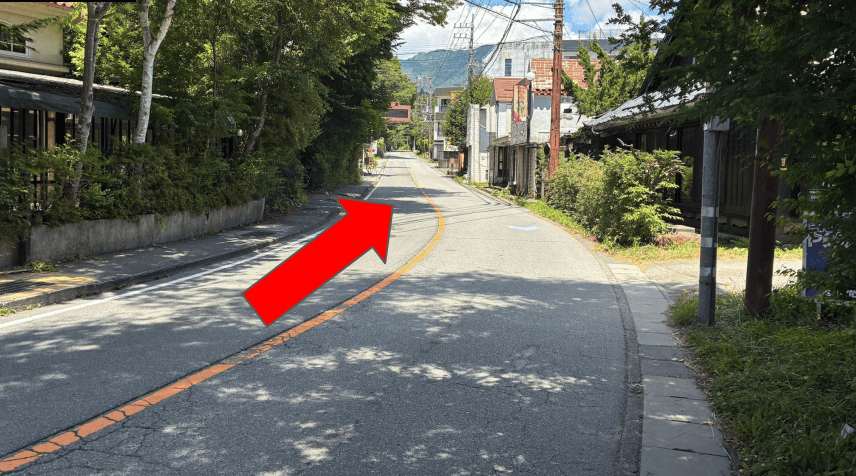 右手に写真の建物が見えましたら、後方に坂がありますのでそこを上り道なりでまっすぐ
