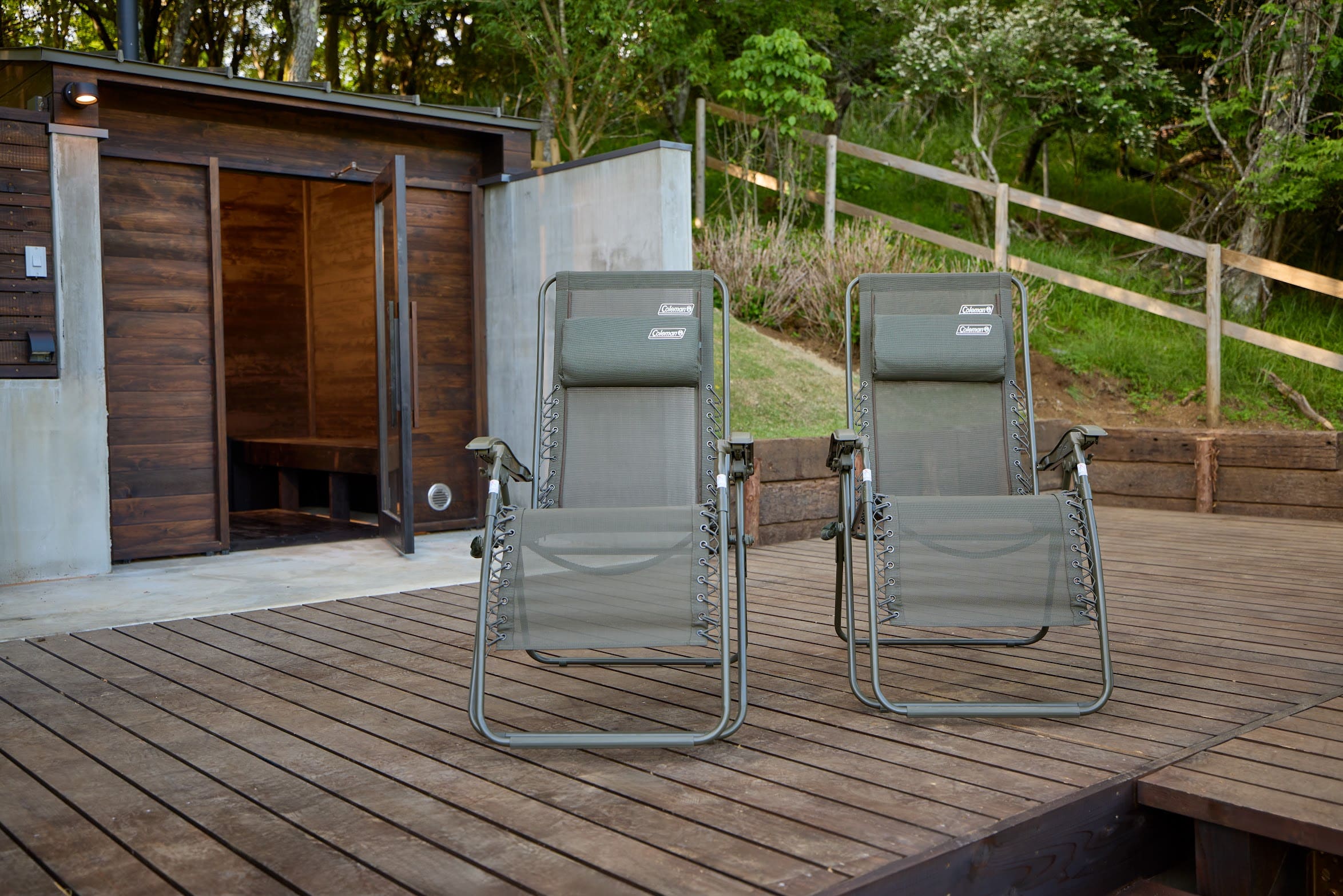 サウナ後のととのい用として、「Coleman」のインフィニティチェアをご用意しています。ととのい椅子は、サウナ横のネイビーの物置にございます。どうぞご自由にお使いください。ご使用後は、元の場所へお戻しくださいますようご協力をお願いいたします。