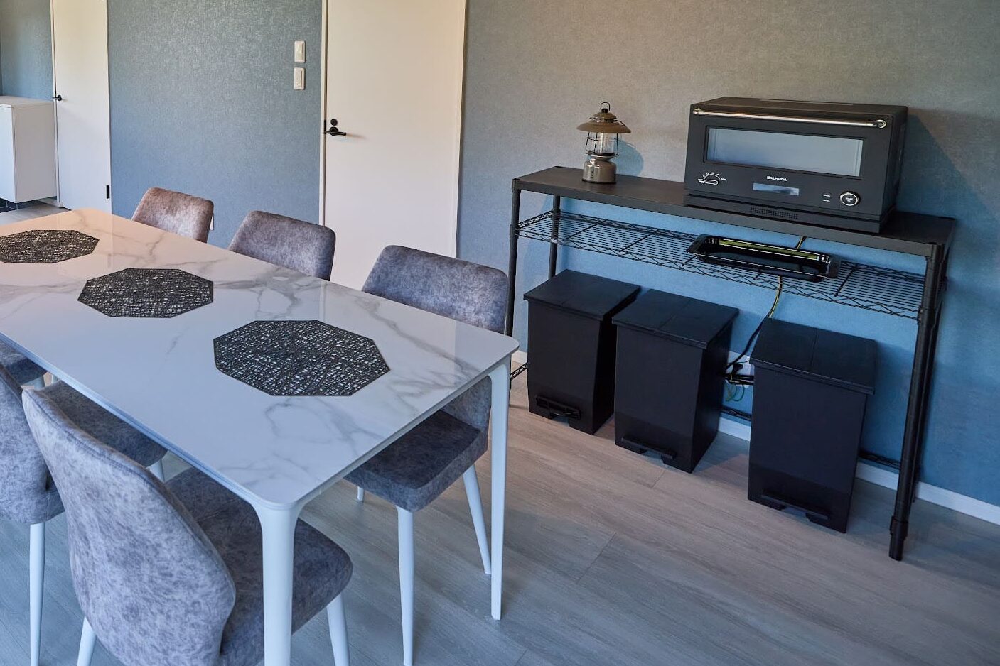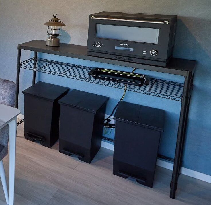 3つ黒いゴミ箱を設置しています。分別のご協力をお願いいたします。※ 資源ゴミ(缶・ビン)がある場合は、洗って分けてゴミ箱付近に分かる様に置いてください。