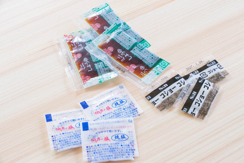 基本的な食器一式/基本的なグラス一式/ワイングラス/カトラリー/コースター/包丁/まな板/鍋一式/ざる・ボウル/ワインオープナー/トングやお玉、ピーラー、菜箸などの一般的な調理器具/ラップ/アルミホイル/醤油(小袋)/塩(小袋)/コショウ(小袋)/こめ油/食器用洗剤/食器用スポンジ