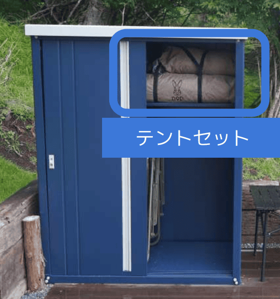テントセットはネイビーの物置の上段右にあります。