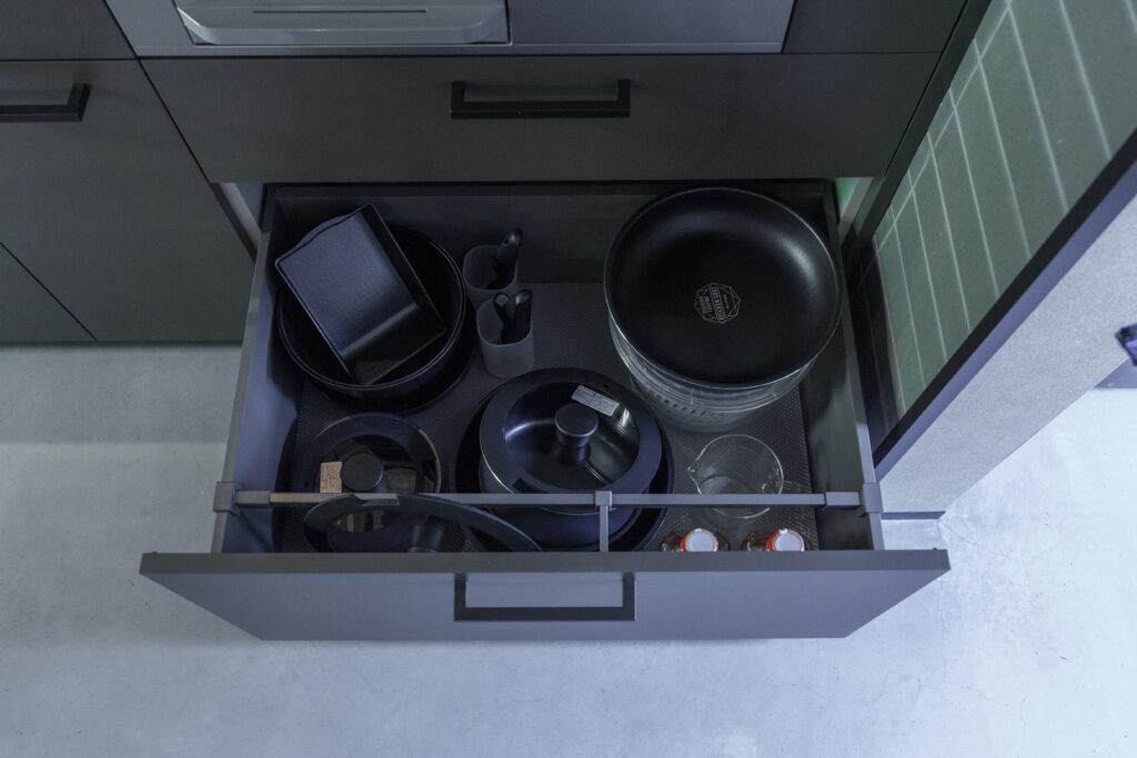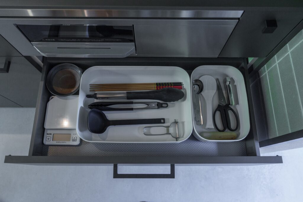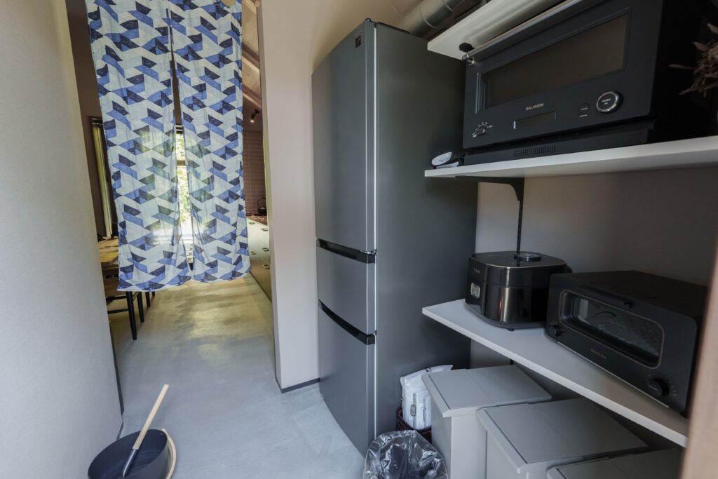 基本的な食器/グラス/ワイングラス/マグカップ/カトラリー(箸・スプーン・フォーク)/サラダスピナー/包丁/まな板/フライパン(大小)/鍋(大小)/ザル/ボウル/トング/菜箸/計量カップ/計量スプーン/ピーラー/キッチンバサミ/ラップ/アルミホイル/醤油/塩/胡椒/こめ油/食器用洗剤/食器用スポンジ/キッチンペーパー/ごみ袋