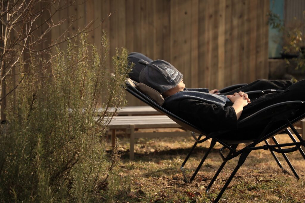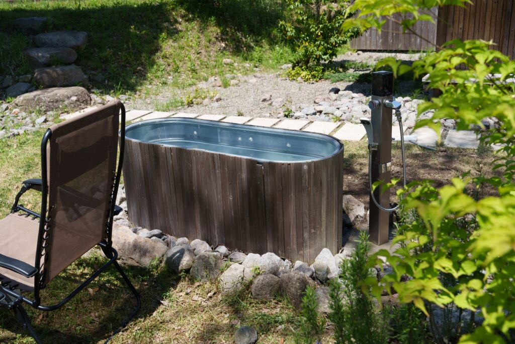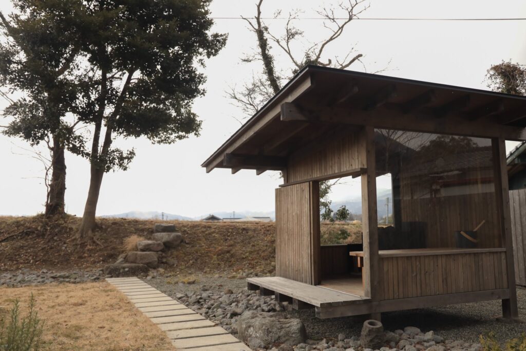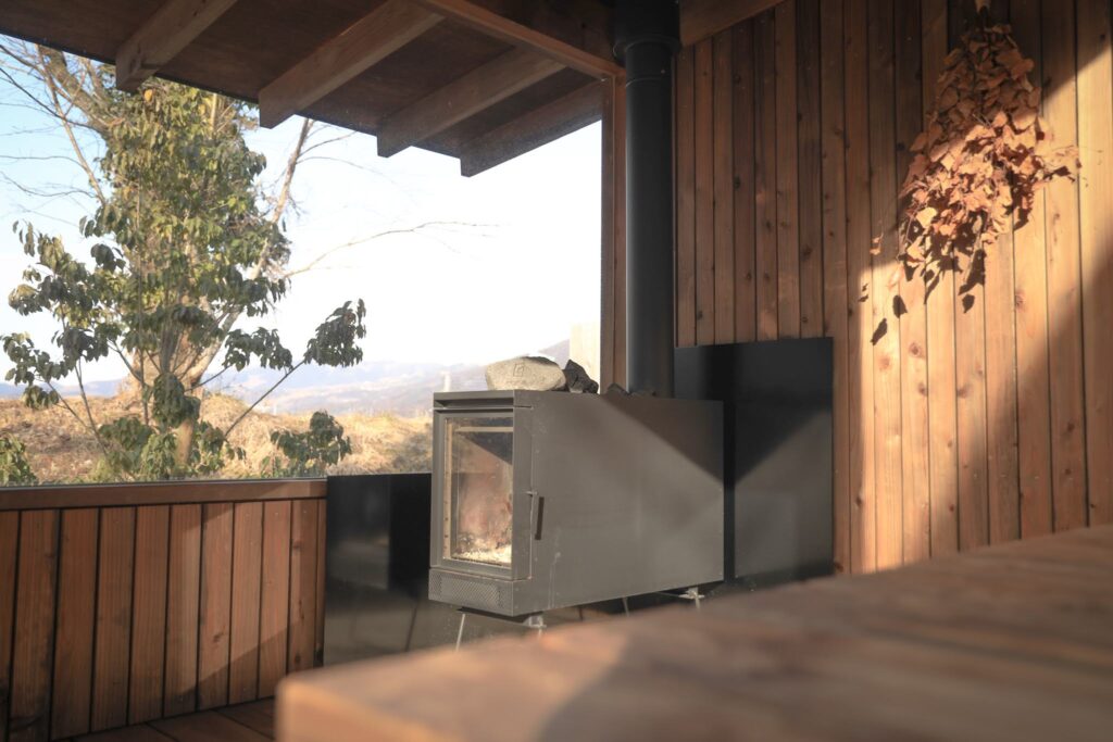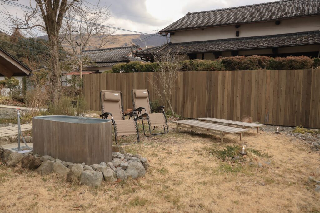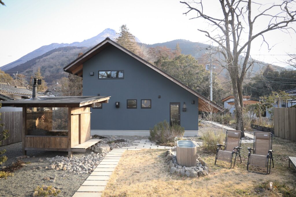 COCO VILLA 湯布院のサウナは、裏庭に設置されています。