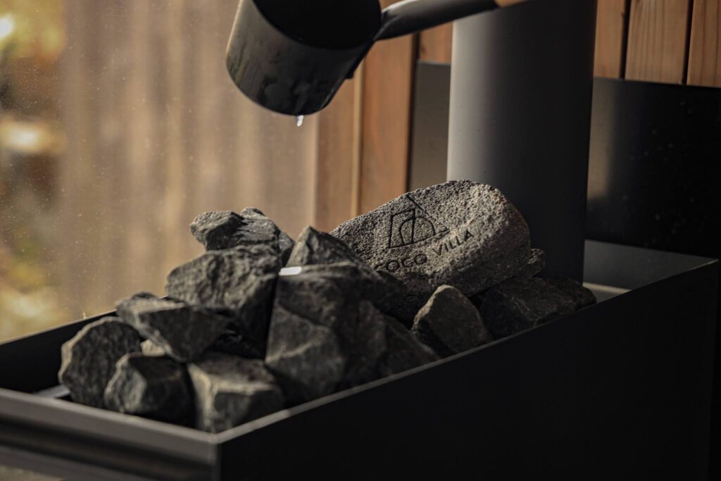 室内が十分に温まってから、石に水をかけてロウリュウをお楽しみください。